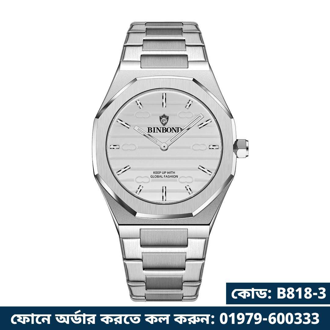 03: BINBOND 818 Silver White | Brand Casual Men’s Quartz Watch Octagonal Luxurious And Fashionable