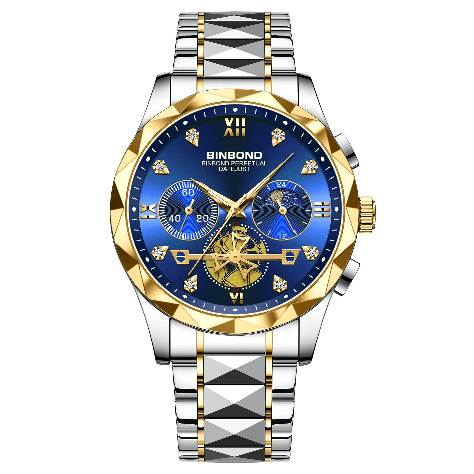 18.BINBOND B1236 Golden Blue | Brand Fashion Tourbillon Dial Quartz Watches Men’s Luxury Stainless Steel