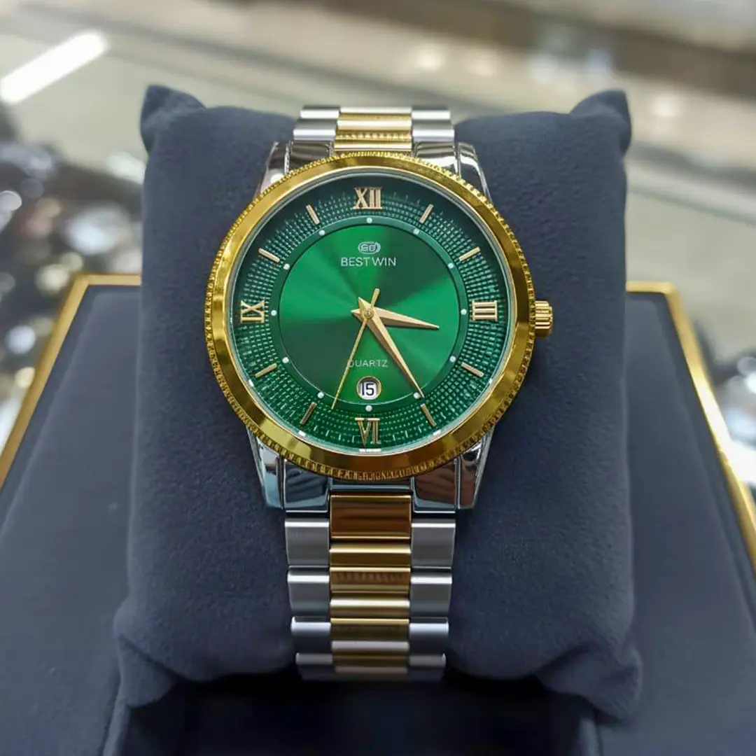 01| BESTWIN 232 | Golden Green Two-tone Wrist Watch For Men Super Premium Quality Quartz Movement Active Auto Date Full Stainless Steel Attractive Green Dial Waterproof Fashionable Formal Watch
