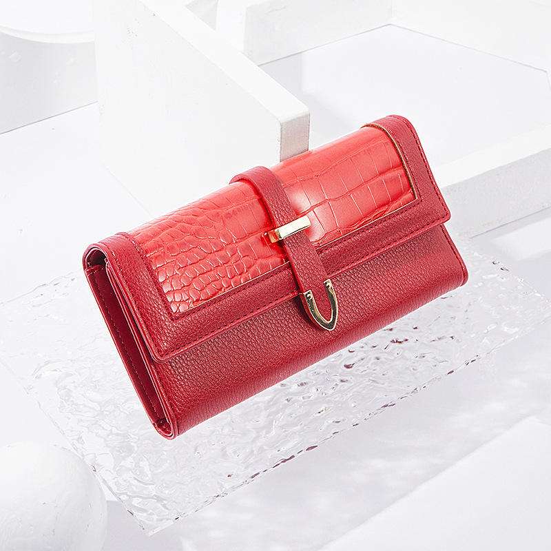 Women’s Fashionable Red Long Wallet with Crocodile Patterned, Buckle and Stone Design